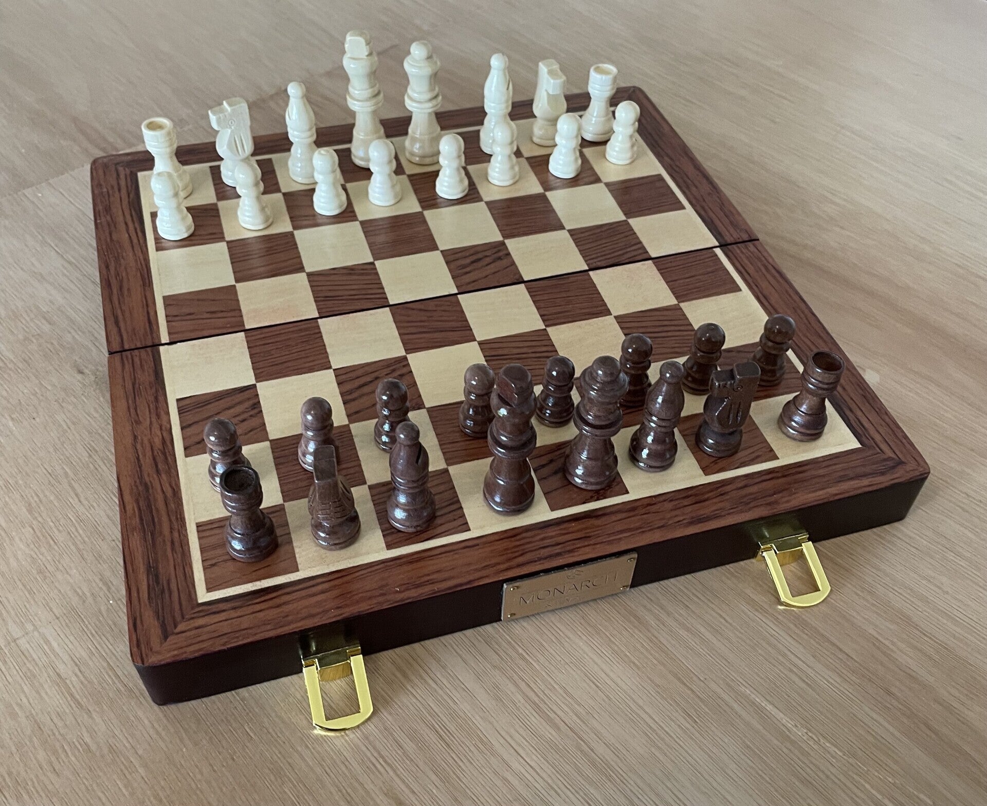 Prachtig compact houten schaakspel van essenhout van MONARCH&TEMPLE. Het bord is opklapbaar en de speelstukken kunnen opgeborgen worden in het bord. Lekker makkelijk voor onderweg. Afmetingen: 30 x 30 x 5,5 cm. Stukken hebben een gemiddelde hoogte van 4 cm. Geschikt voor kinderen alle leeftijden mits de regels duidelijk worden uitgelegd.